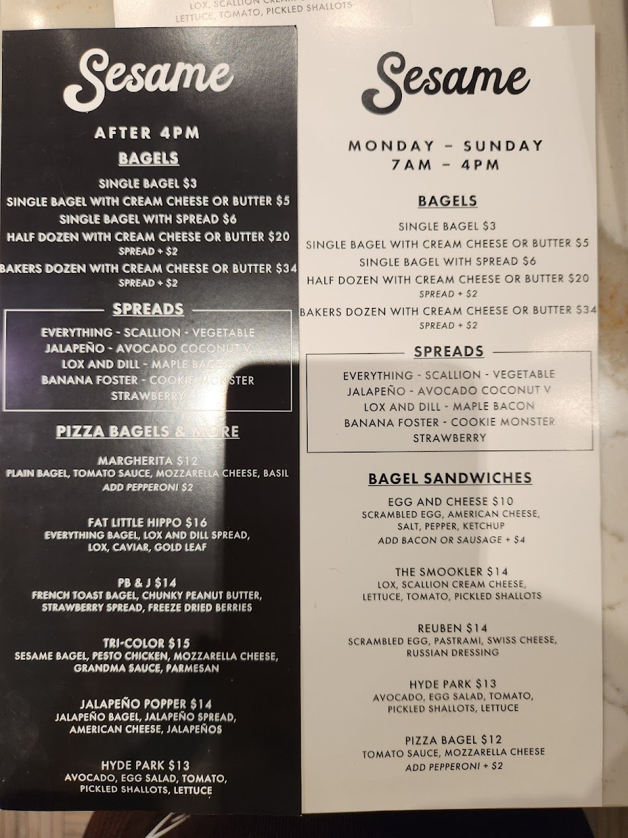 Besides bagels, Sesame serves savory sides, including housemade chicken and egg salad, as well as crispy bacon. The ambiance is inviting, perfect for sipping coffee and savoring a meal. Reviews highlight the friendly staff and exceptional service, creating a warm dining environment.
